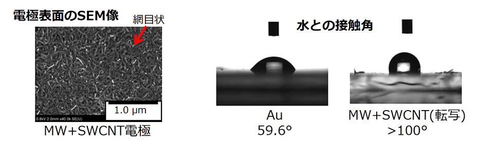 カーボンナノチューブ(CNT)はナノスケールの網目状構造を持つため、ガス透過性電極となります。ガス分子が出入り上部電極は、ガスの移動を妨げないことも重要であり、例えば水蒸気を透過する湿度センサの場合は、高い撥水性を持たせることで高速な応答が期待できます。
